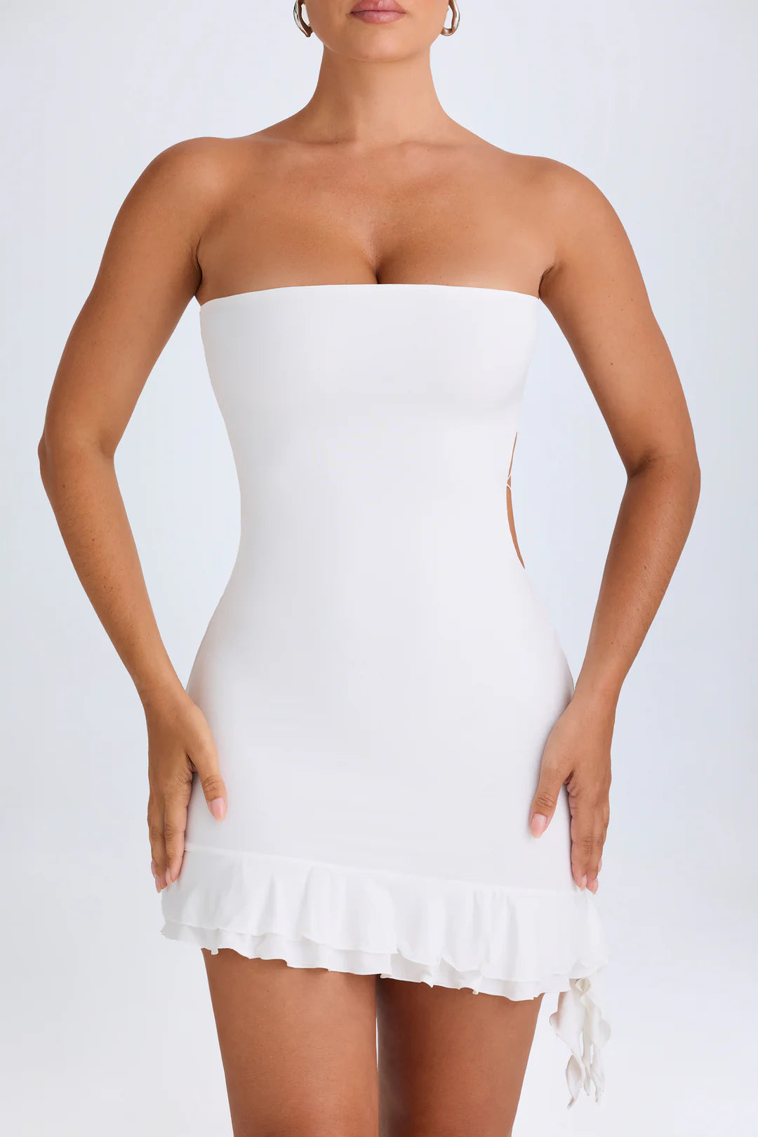 Make a stunning entrance in this figure-flattering mini dress, designed to command attention. Crafted from premium sheer jersey with a hint of stretch, it hugs your curves in a perfect bodycon silhouette. The dramatic open back is elevated with elegant tubular criss-cross straps, while an asymmetric ruffle-trim hem adds a playful, modern edge. Perfect for a night out or a special occasion where you want to feel confident and unforgettable.