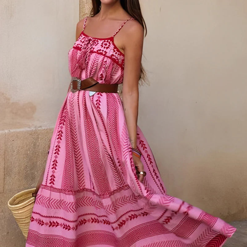 Embrace your bohemian spirit in this vibrant maxi dress, designed for sun-drenched days and warm summer nights. Its eye-catching pink and red floral print evokes the feeling of a faraway getaway.