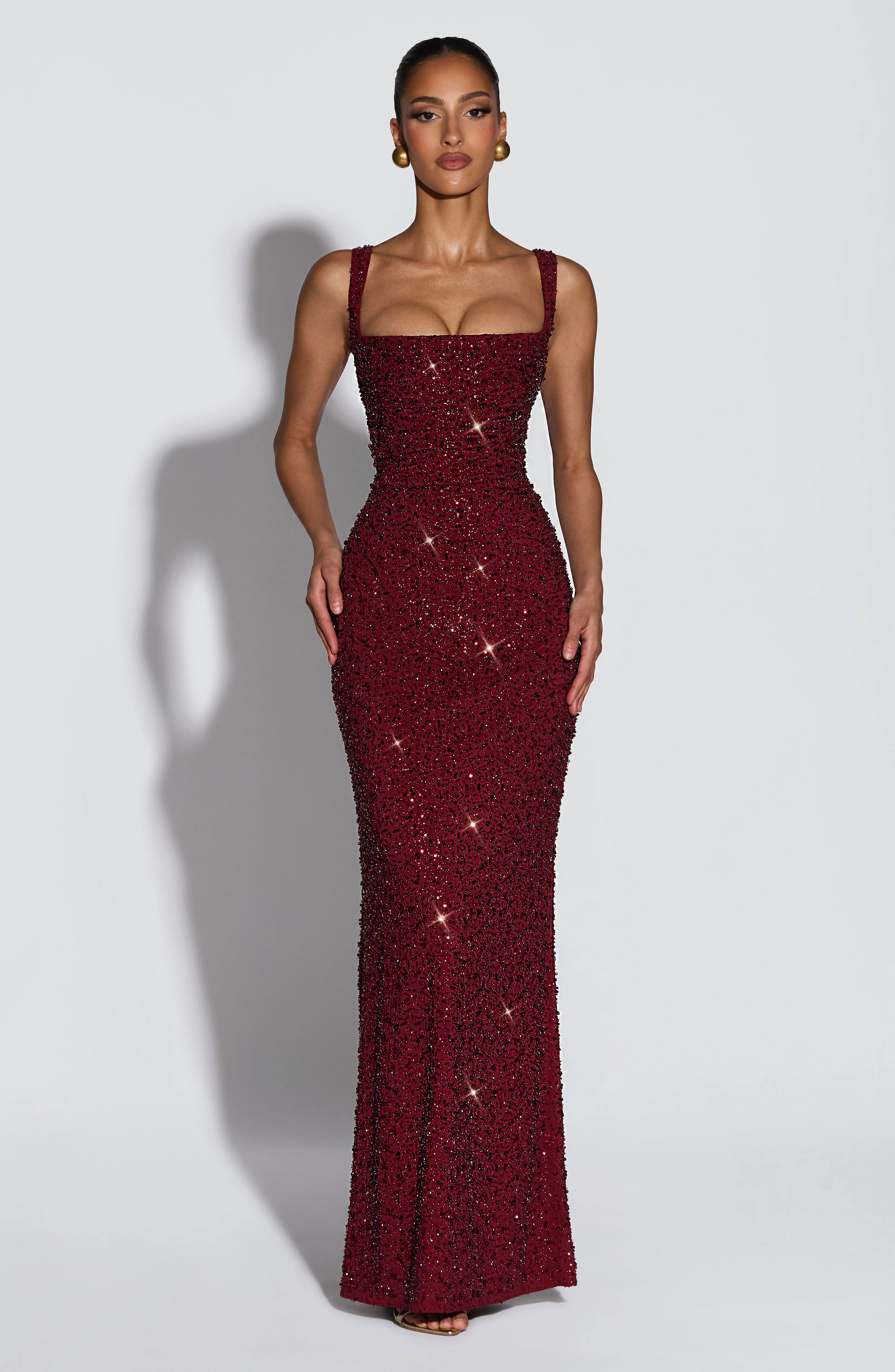 Dazzle in this burgundy sparkle maxi dress designed for unforgettable nights. Embellished chiffon fabric catches the light with every move, while the square neckline and pleated drape detail offer timeless sophistication. Asymmetric pleats on the bodice and tapered straps create a universally flattering silhouette. The elegant lace-up back adds a captivating final touch to your glamorous look.