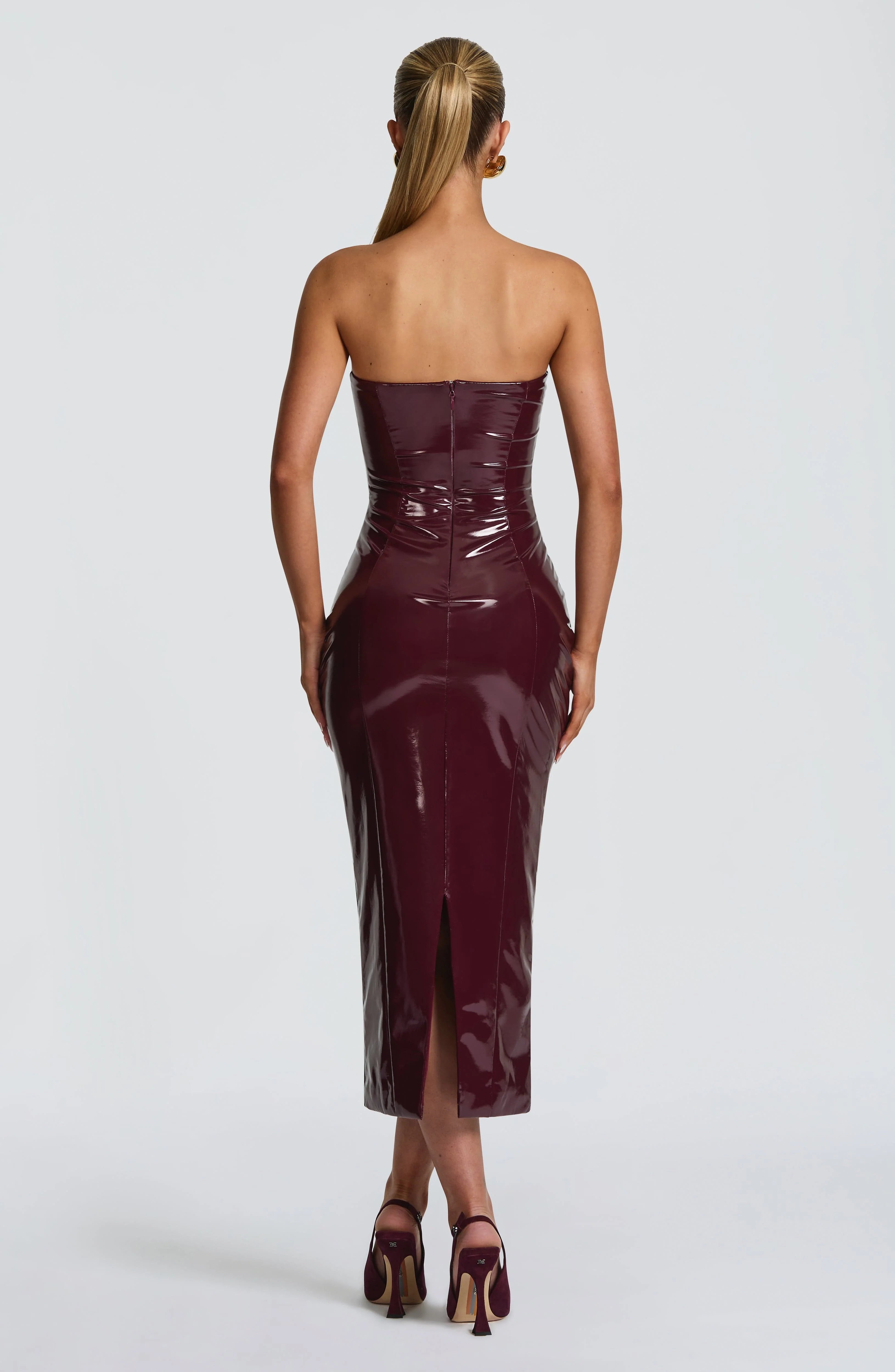 Make a statement in this high-shine vinyl midi dress, designed to contour and elevate your look. The body-hugging fit, underwired cups, and princess seams create a stunning, confident silhouette perfect for a night out. Adjustable detachable straps and a graceful back split add versatility and effortless style.