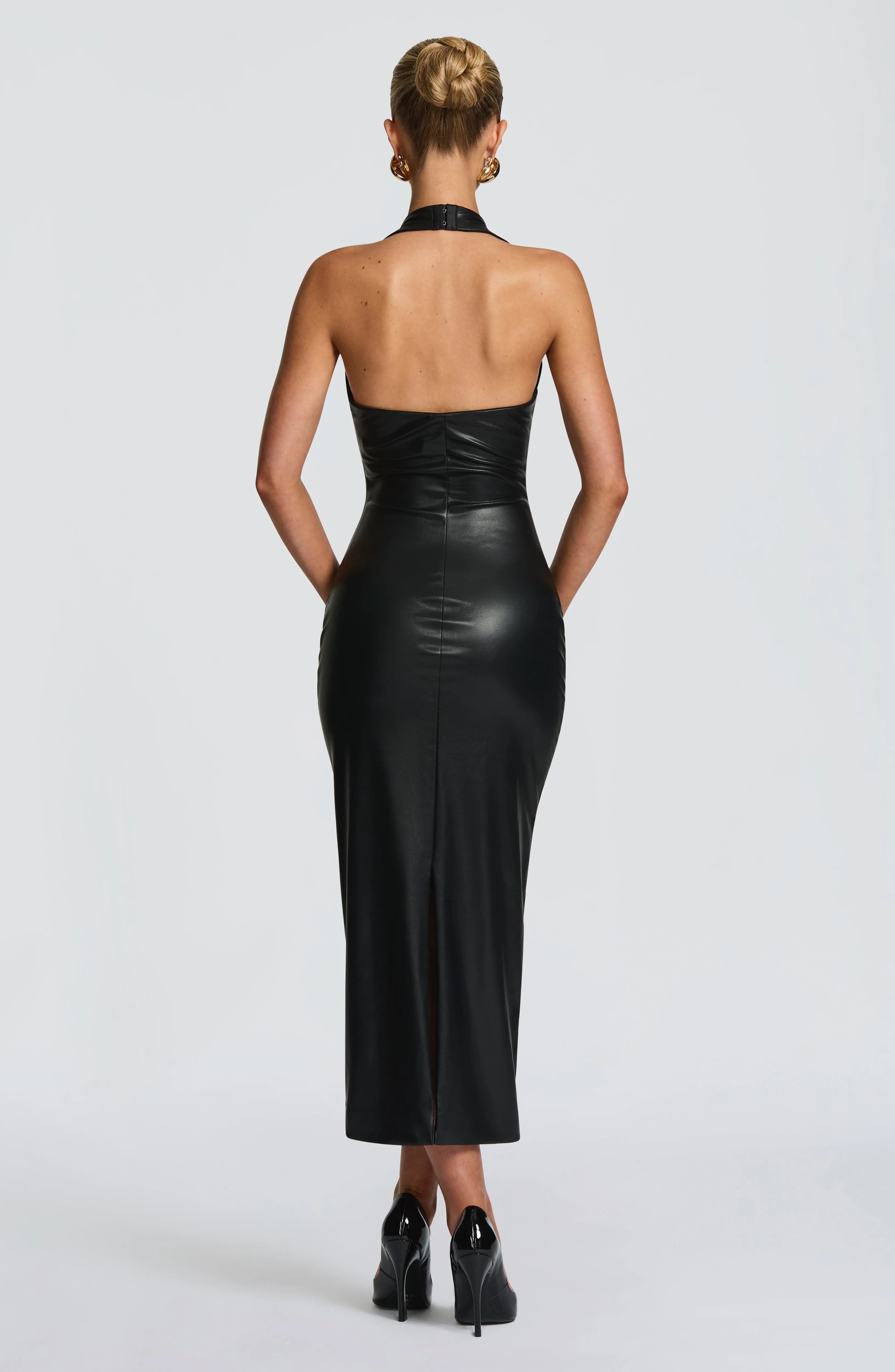Command attention in this sleek black midi dress, crafted from soft faux leather for a luxurious feel. The sophisticated plunge halter neckline, reinforced with U-wire support, creates a stunning silhouette. A body-hugging fit and elegant midi length deliver a timeless look perfect for evenings out or special occasions.