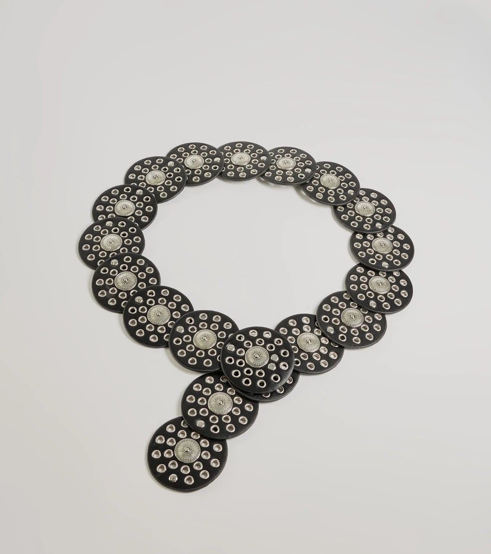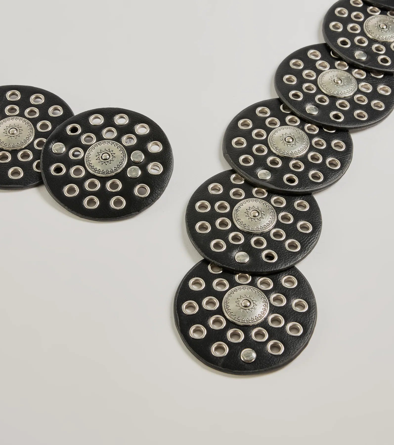 This statement concho belt brings a bold desert boho aesthetic to any outfit. The faux leather circular shapes, detailed with medallion centers and grommet accents, create a stylish western vibe perfect for elevating your look. Layer it over a denim jumpsuit, a flowy maxi dress, or your favorite high-waisted jeans for an effortlessly chic statement.