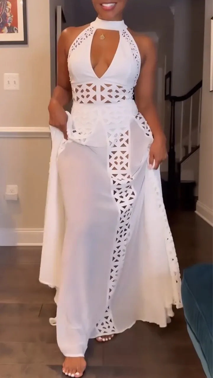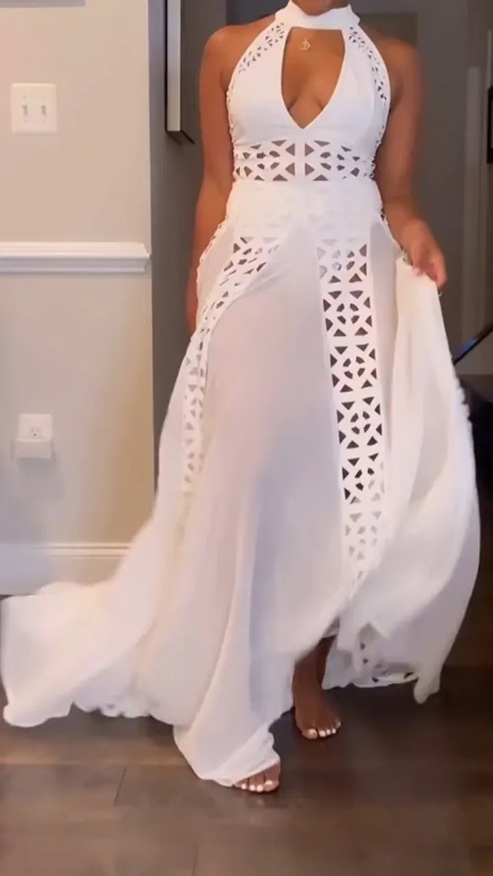 Make a dramatic entrance in this elegant evening dress, designed with sophisticated hollow splicing and a graceful neck-hanging silhouette.