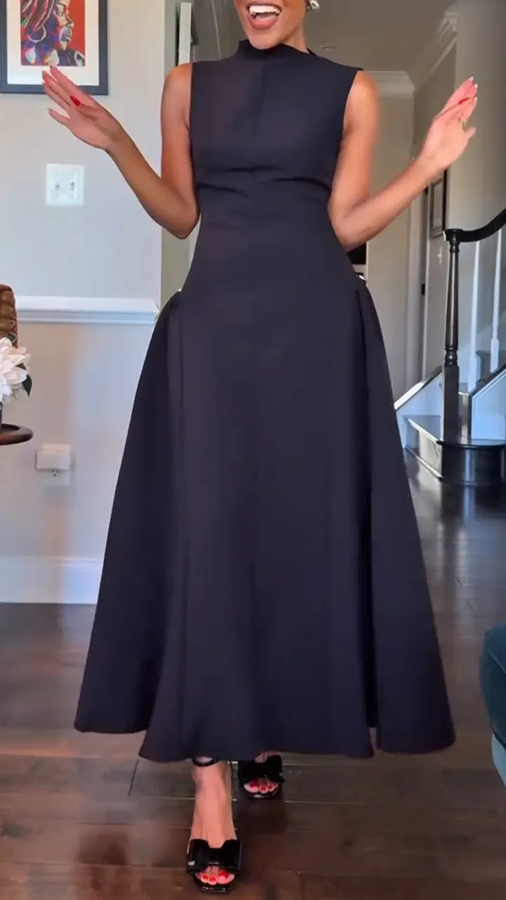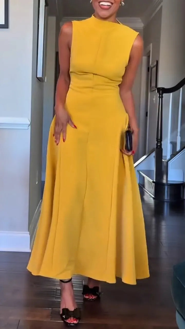 Discover effortless elegance with this solid color midi dress. Its timeless round neckline and graceful silhouette create a look of refined sophistication perfect for any occasion.