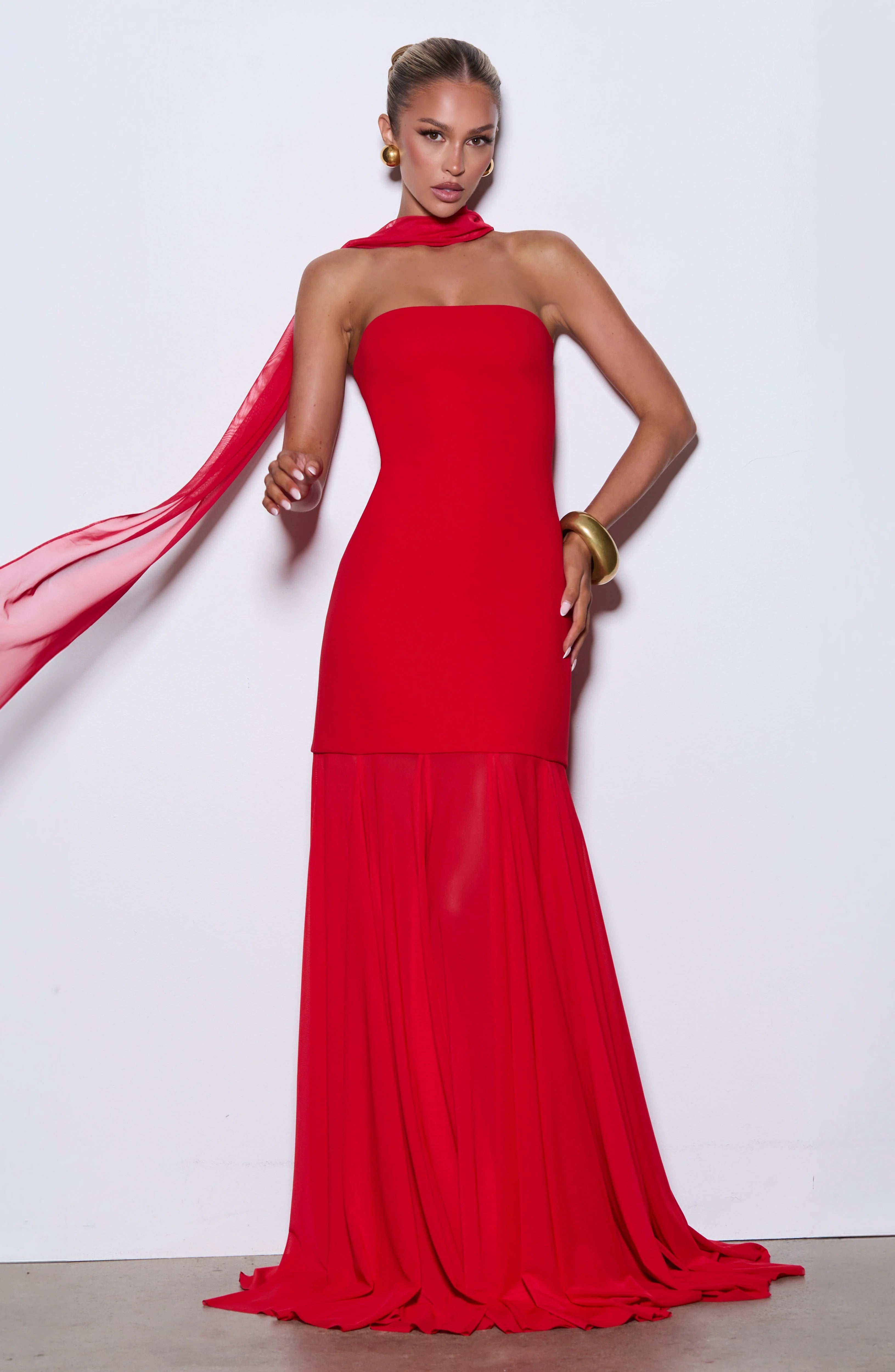 Command attention in this stunning strapless red gown, featuring a sleek, body-hugging crepe bodice that flows into a dramatic semi-sheer mesh skirt. Multiple godets create captivating movement with every step, making this full-length dress perfect for galas, formal events, and unforgettable evenings.