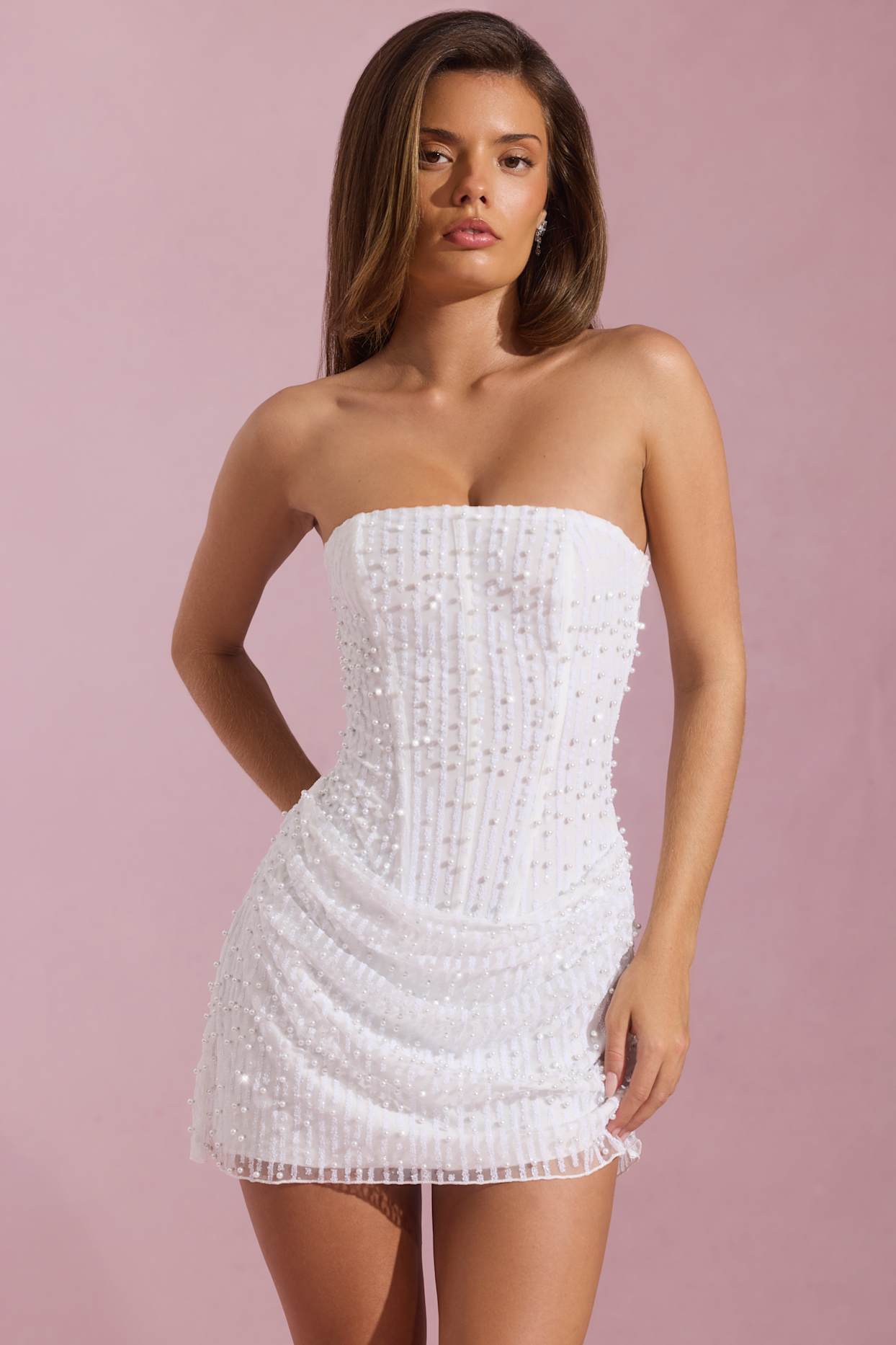 Meet your new event essential. The Ziya mini dress features a dazzling all-over glitter mesh, elegantly overlaid with three-dimensional beads for a captivating, head-turning effect. Designed with a built-in corset bodice and draped detailing, this universally flattering A-line silhouette ensures you feel confident and radiant all night long.