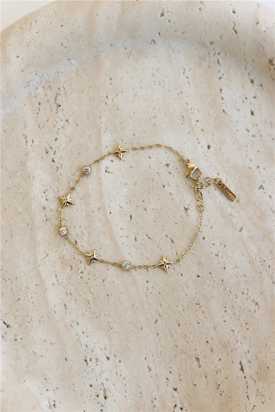 Add a radiant glow to your wrist with this enchanting charm bracelet. The combination of lustrous gold, celestial stars, and sparkling diamantes creates a piece that feels both festive and timeless. Wear it alone for a subtle hint of holiday sparkle, or layer it with your favorite bracelets to build a glamorous, eye-catching stack perfect for parties, gatherings, or elevating your everyday look.