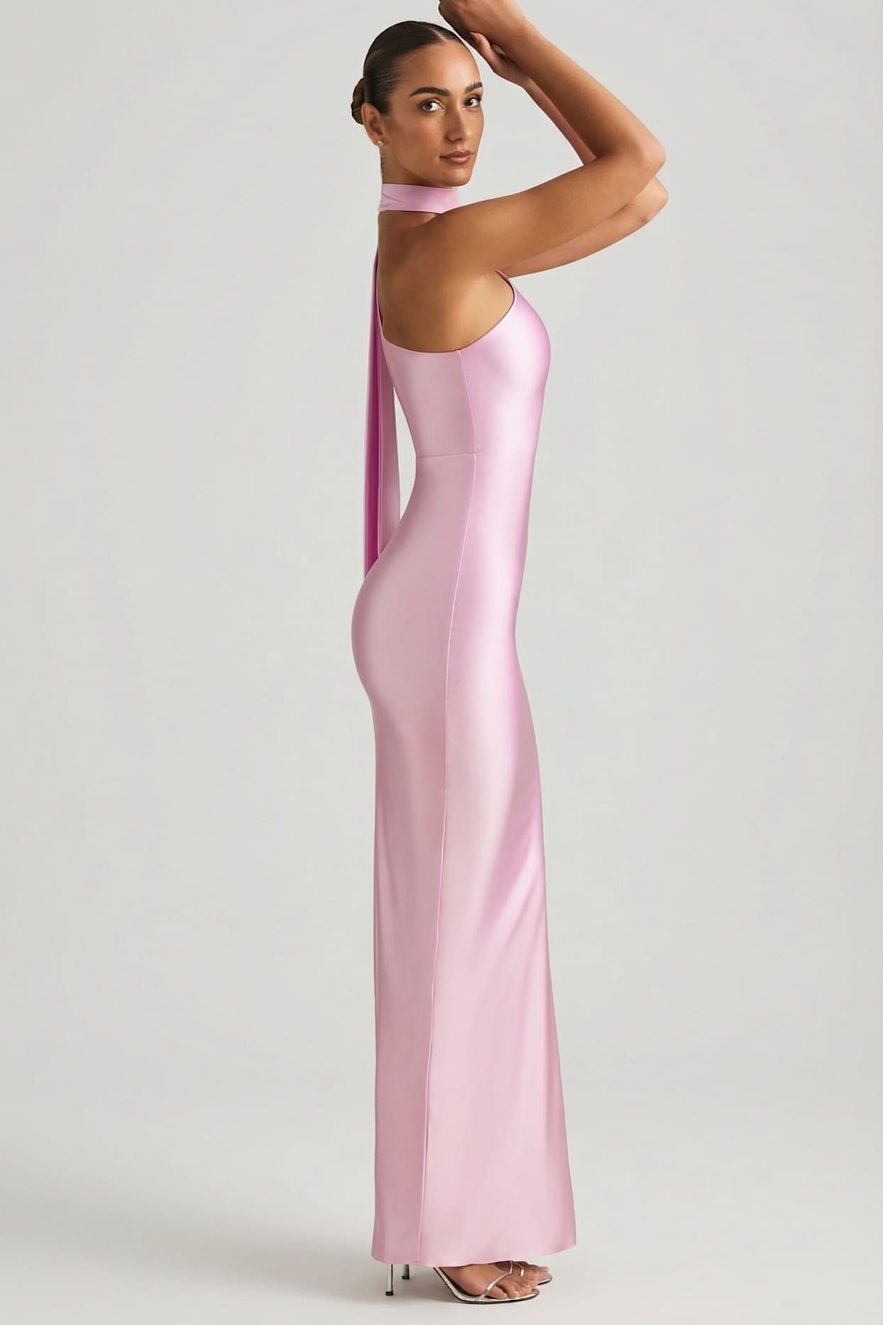 Command every room in this stunning one-shoulder maxi dress, designed for unforgettable evenings and special occasions. Crafted from premium high-shine satin jersey, it drapes beautifully to hug your curves with a liquid-like, elegant effect. The dramatic asymmetric silhouette, complete with an attached neck scarf and a thigh-high side split, creates a look that's both sophisticated and bold.