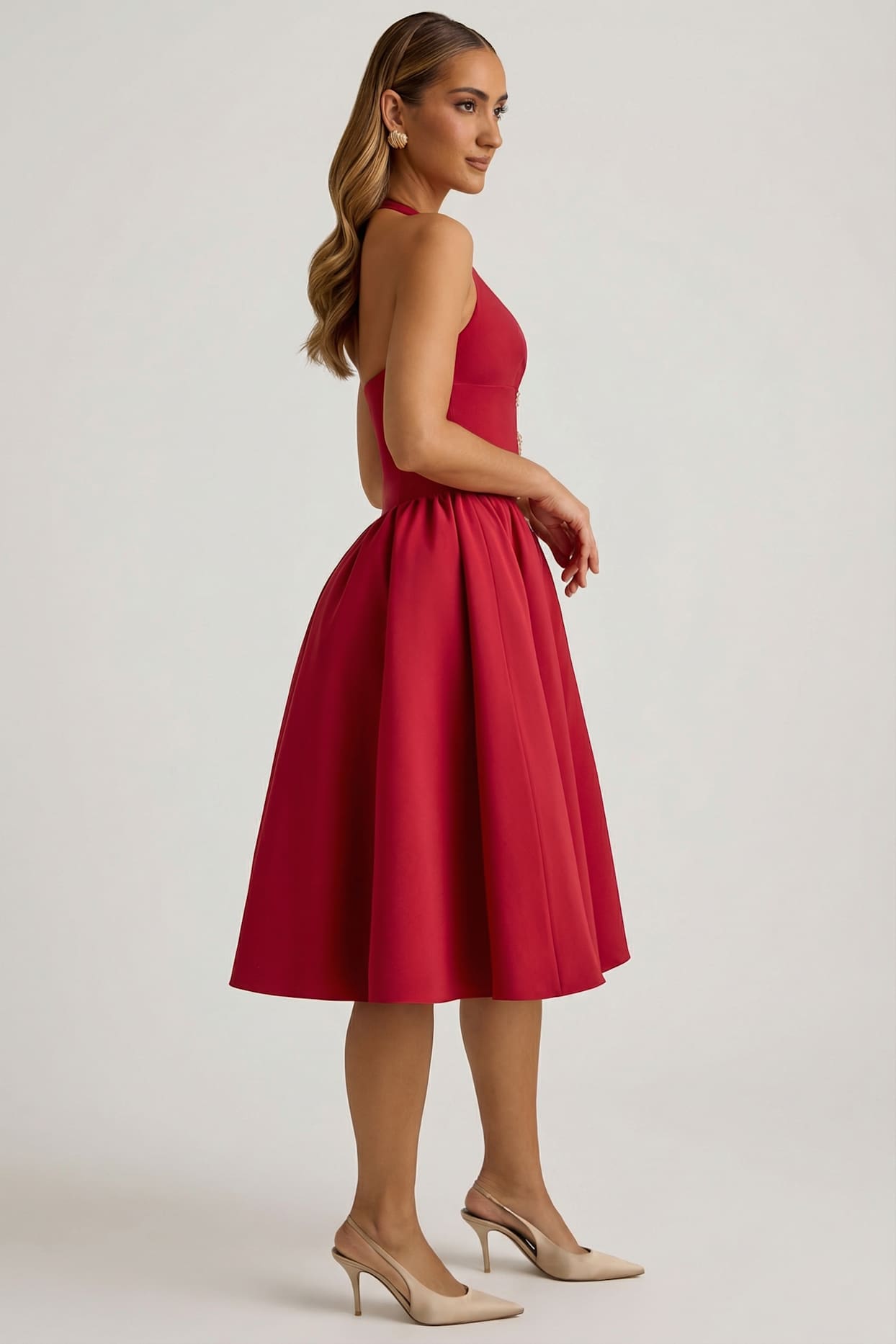 Command attention at every celebration in this stunning halterneck midi dress. Expertly tailored from premium stretch fabric, it sculpts your silhouette with a fitted drop-waist bodice and flows into a beautifully gathered, voluminous skirt. The dramatic plunge neckline is elegantly accented with a trio of faux-pearl bows, creating a look of timeless sophistication perfect for weddings, galas, and special nights out.