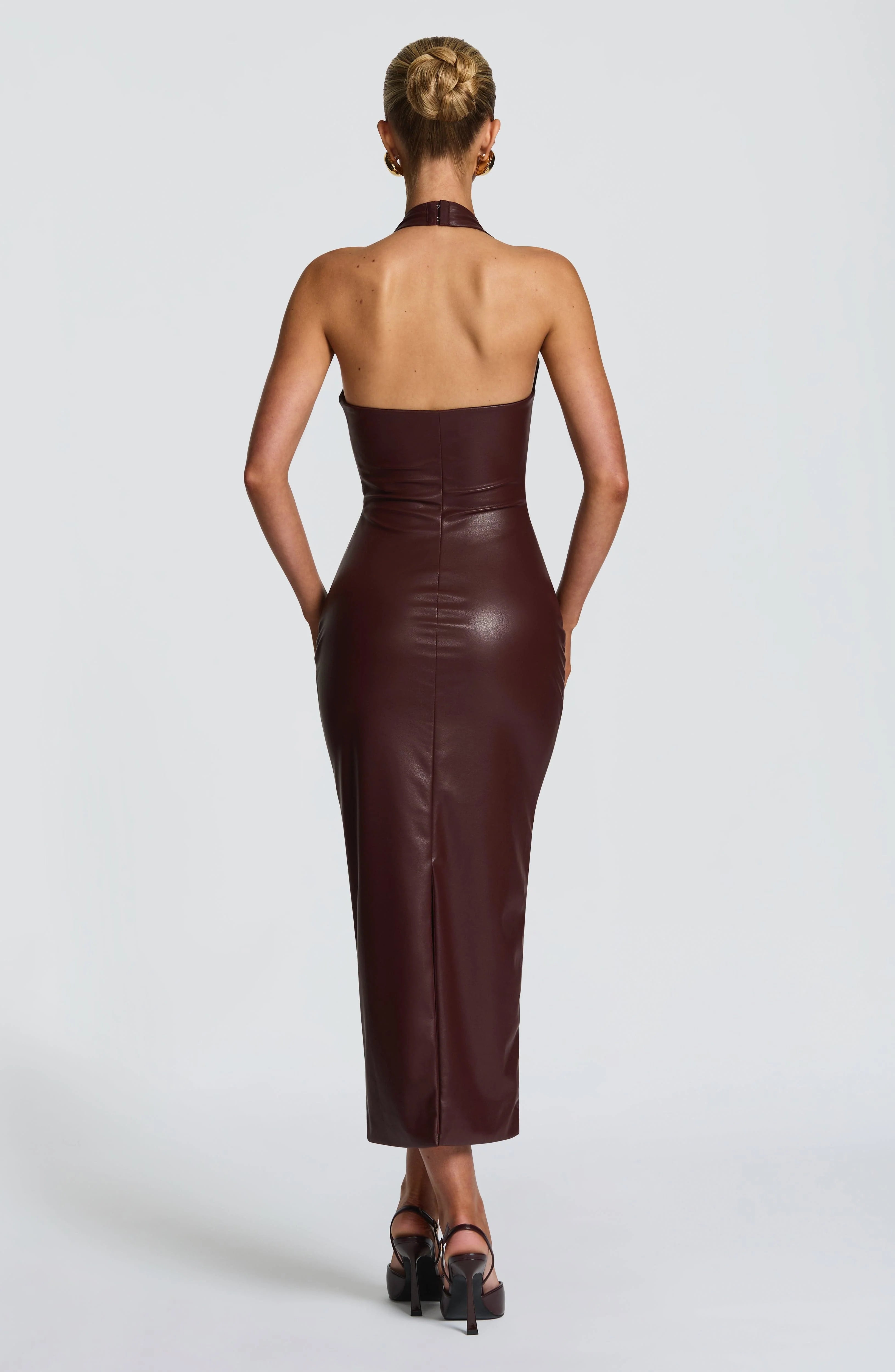 Wrap yourself in timeless sophistication with this body-hugging midi dress. Crafted from sumptuous faux leather, it drapes elegantly for a look that's both bold and refined. The dramatic plunge halter neckline, accented with delicate gathers and a supportive U-wire, creates a striking silhouette.