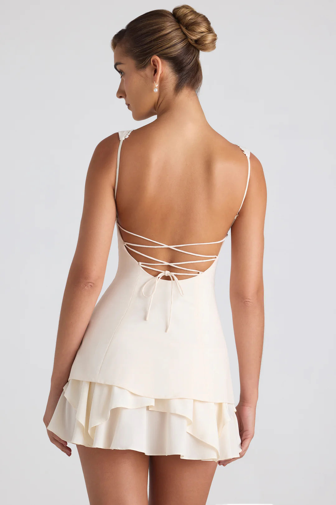 Capture the romance of summer in this enchanting mini dress. Lightweight and effortlessly chic, it features a sculpted pintucked bodice with shaped cups for a flattering fit. The dramatic open back with adjustable lace-up detailing adds a touch of allure, while the contrasting ruffled skirt creates beautiful movement with every step.