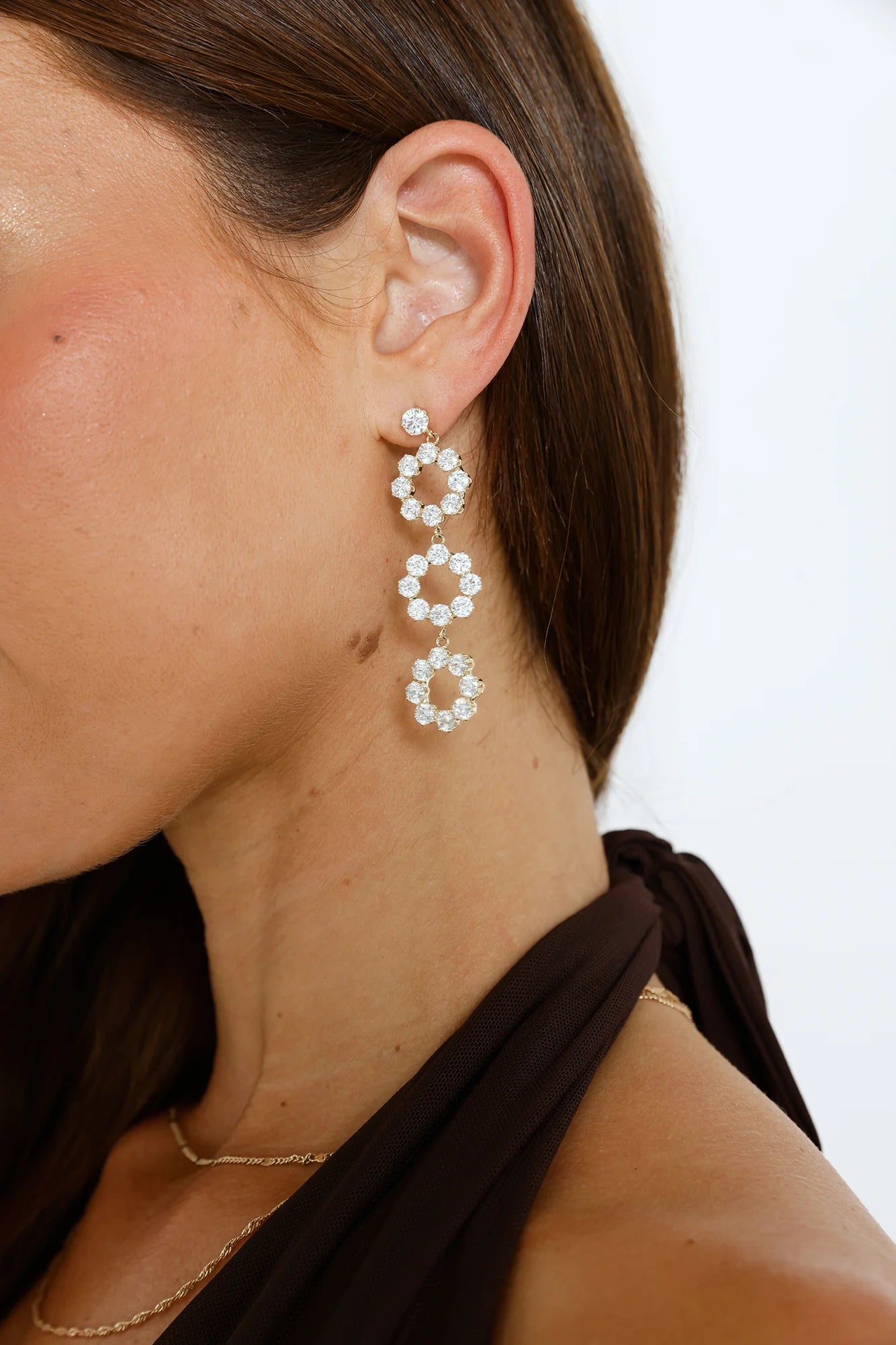 Turn heads with these shimmering earrings, designed to catch the light and add instant glamour. The dazzling diamante details and graceful dangle create a captivating look perfect for date nights, special events, or elevating your everyday style. Their versatile gold-tone finish pairs effortlessly with everything in your wardrobe.