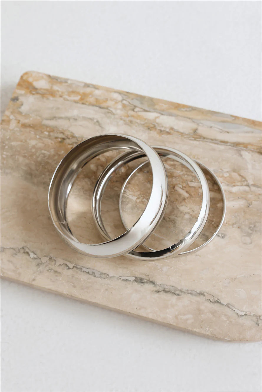 Add a touch of modern polish to any outfit with this chic silver bangle trio. Perfect for creating a layered arm party or making a subtle minimalist statement, these sleek pieces transition effortlessly from day to night. Their versatile shine complements every look, offering an easy way to elevate your everyday accessory game.