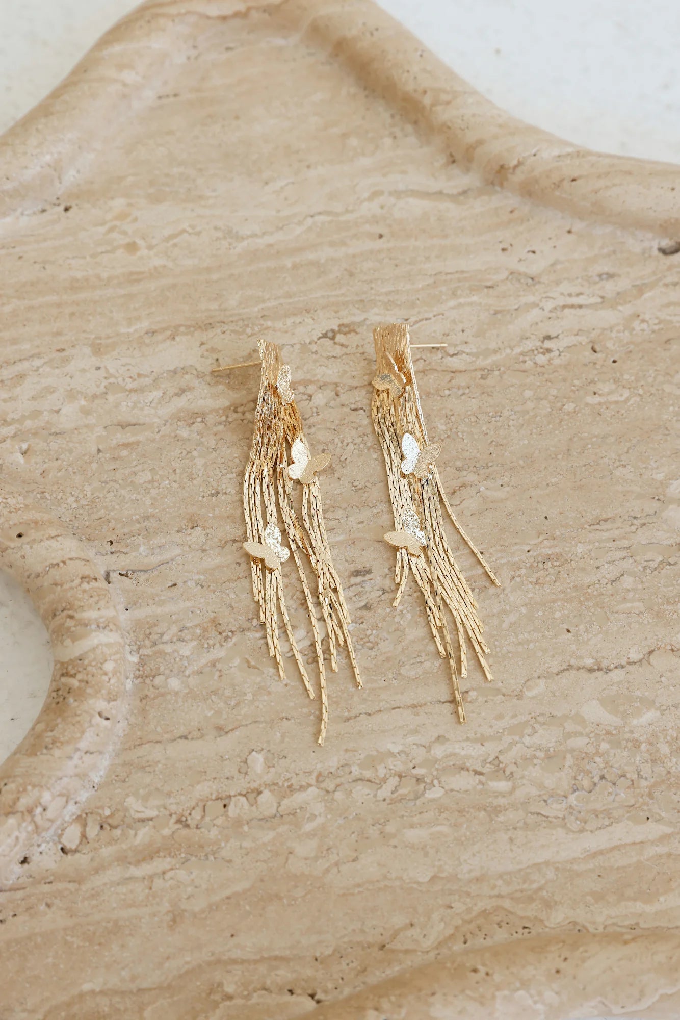 Let your style take flight with these enchanting earrings. The delicate gold chains and playful butterfly charms add a whisper of elegance and a dash of dreamy charm to any outfit, perfect for elevating your everyday look with effortless glamour.